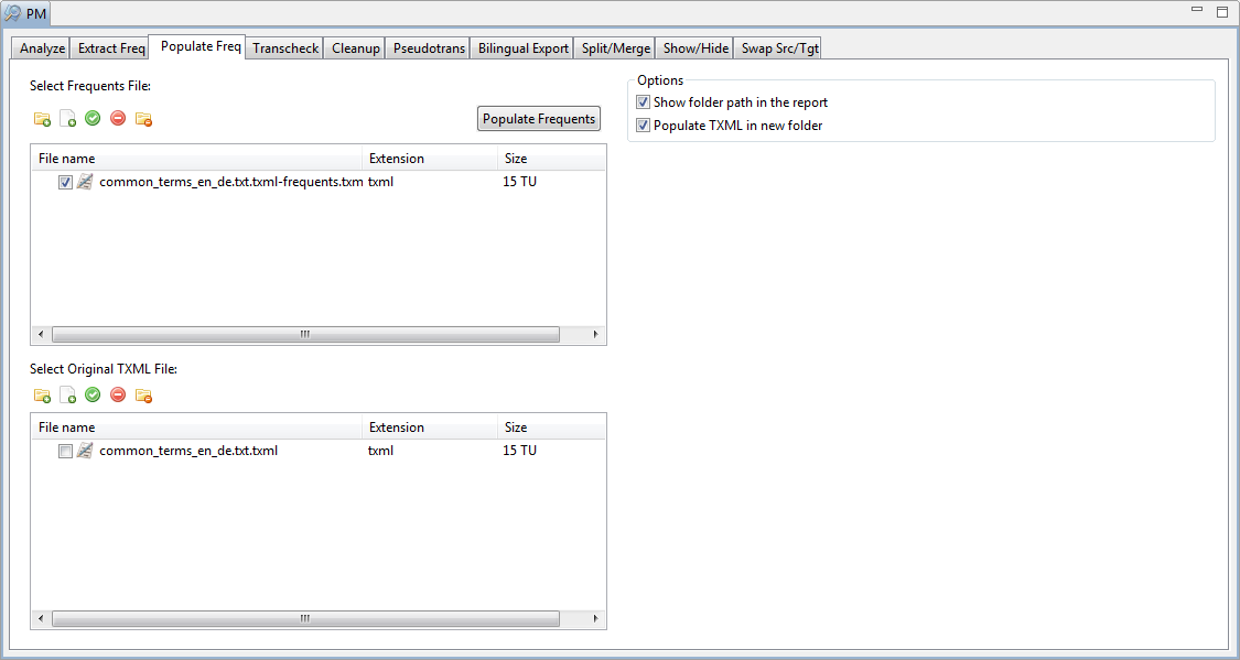 In the Populating frequents process, the original TXML file is populated by the frequents file containing all translated content.
